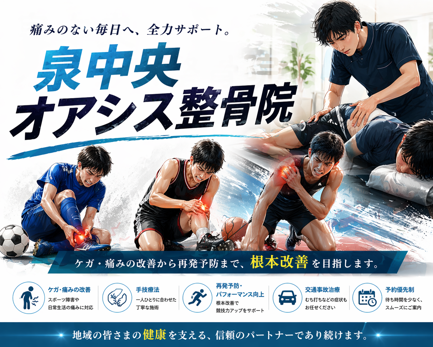 泉中央オアシス整骨院では、痛みが出る前の段階から身体の状態をチェックし、ケガのリスクを最小限に抑える施術を提供しています。